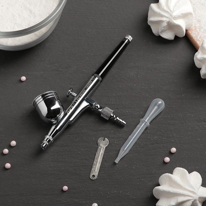 Чаще всего его используют для готовых тортов, мастичных, кремовых или муссовых, когда необходимо распределить краску по поверхности, избегая подтеков и непрокрашенных участков. С помощью такого инструмента, подключенного к компрессору, можно создавать интересные цветовые переходы или акценты. Краска распределяется легко и практически без усилий, так что готовый кремовый декор тоже можно раскрашивать. Поставляется в чехле для хранения. В комплект входят дополнительные приспособления для работы, в том числе настроечный ключ.