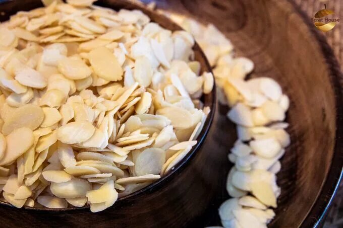 Миндальные лепестки - миндаль очищенный, отбеленный, нарезанный лепестками,кремового цвета, имеющий приятный вкус и аромат.