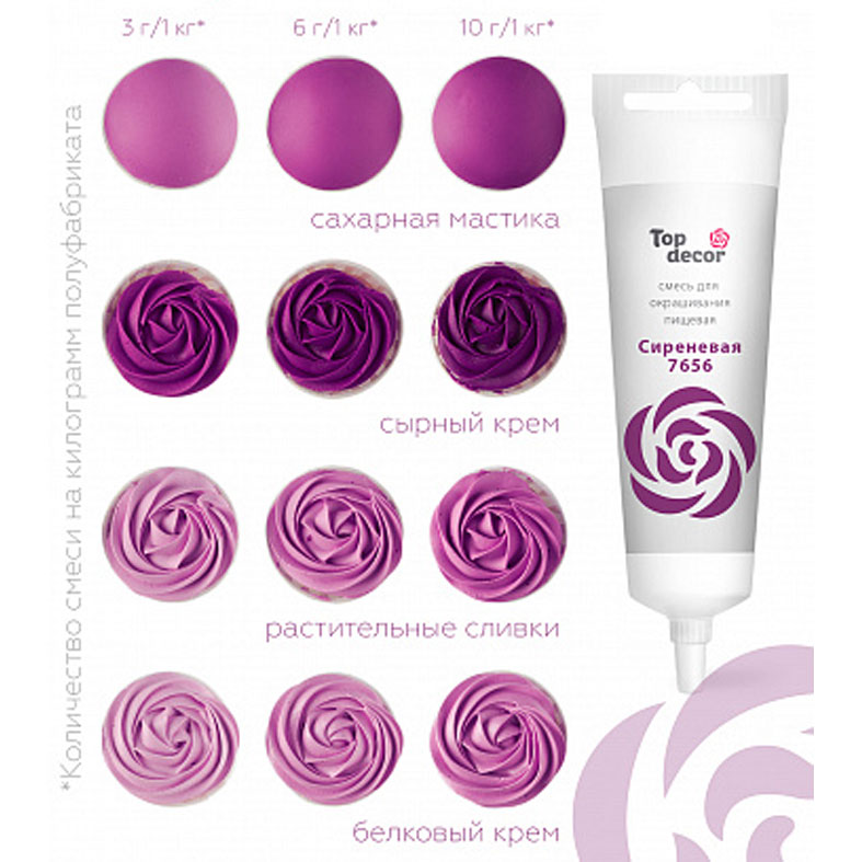 Пищевые красители топ продукт российского производства предназначен для окрашивания муссов, жидкостей, кремов (как масляных, так и белковых), мармелада и пр.