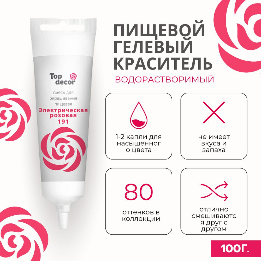 О товаре: Краситель водорастворимый с высокой концентрацией красящего пигмента. Густая консистенция позволяет ему хорошо окрашивать по всей массе основные кондитерские полуфабрикаты (желе, мусс, крем, тесто, мастика и другие),не изменяя их консистенцию. Не имеет вкуса и аромата, благодаря чему сохраняет первоначальные вкусовые свойства окрашиваемого продукта.
